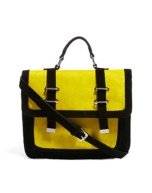 Add a pop of colour to the school or shopping run with ASOS’s bumble bee hued satchel. A combination of leather and faux pony skin offers this season’s texture clash trend.