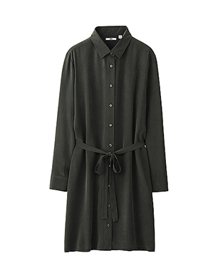 Uniqlo’s 100% silk range is great value for money. Pair this mossy green shirt dress with grey ribbed tights and tan ankle boots this autumn.