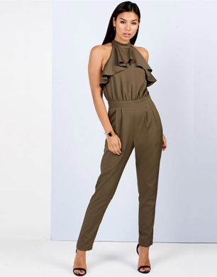 GIRLS ON FILM KHAKI RUFFLE TAILORED JUMPSUIT