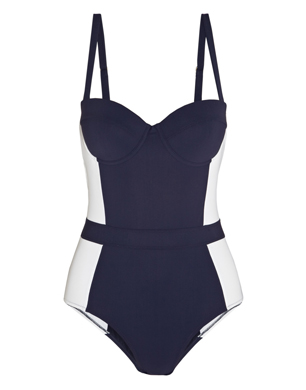 Hone your beach body with Tory Burch’s optical illusion panels and underwired cups. Cover up and protect with a floppy sun hat and man’s white shirt.