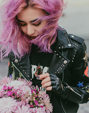 They go for the black aesthetic but they might have their hair dyed in unnatural colors. In terms of accessories, studded belts play the main role.