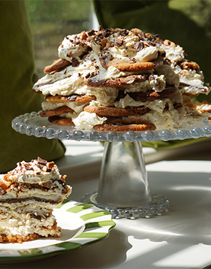 - Arrange 6 cookies in a circle on a plate, with 1 cookie in the center. Spread a layer of cream on top, leaving a slight border.