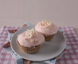 9.Top the cooled cupcakes with frosting with a palette knife. Sprinkle each cupcake with white chocolate stars.