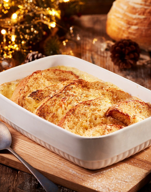 - Arrange the buttered sourdough slices in the greased dish, overlapping them at the edges. Pour over the custard mixture, making sure it covers all the exposed bread. Sprinkle over the demerara sugar, then bake the pudding for 25 – 30 minutes until the top is golden brown and the custard has set. Remove from the oven and serve immediately.
