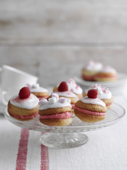7) For the icing, sift the icing sugar into a bowl then gradually mix in enough water to make a smooth icing that can be spread. Spoon a little on to the top of each whoopee then spread over the tops with a knife. Decorate with fresh raspberries and sugar sprinkles, slices of mini marshmallow, or sugar flowers. Leave to set for 15 minutes then arrange on a serving plate.