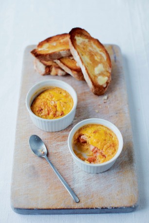 3. Put the ramekins in a deep baking dish and fill the dish with enough boiling water to come halfway up the sides of the ramekins. Bake for 15–18 minutes until firm to the touch and very lightly browned. Serve warm with buttered toast.