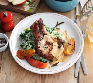 4) Transfer the apples to the plate with the pork, and cover. Put the roasting tin on the hob, add the cider, bring to the boil, then bubble for 3-4 minutes, stirring until reduced by half. Stir in the crème fraîche and mustard, season and warm through. Pour over the pork, apples and kale mash to serve.