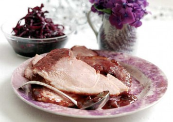 - Serve hot gammon with roasted potatoes and parsnips and braised red cabbage with apple.