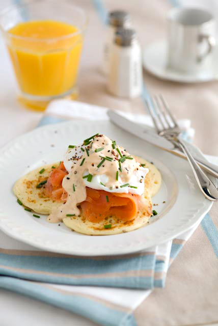 Smoked Salmon BliniTreat yourself this weekend to an indulgent brunch of smoked salmon blinis with pached eggs and a rich ceese and chive sauce.