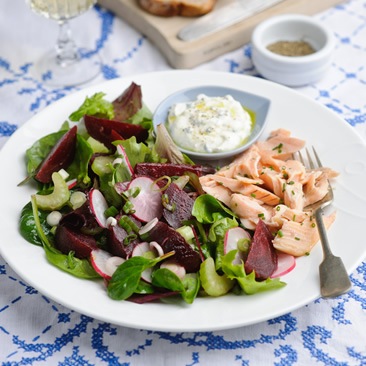 A light and healthy salad. The beetroot complements the fresh trout perfectly. Serve with new potatoes or rye bread.