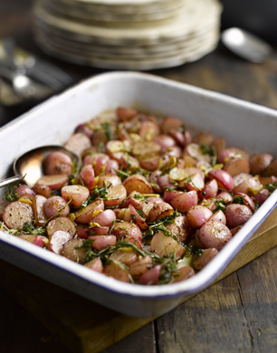 roasted radishes with garlic and rosemary in roasting dishSwap the spuds for roasted radishes with garlic and rosemary.