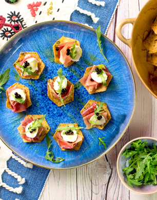 - Line Serrano & Yucatan tortilla chips on a platter, place ham folded neatly on each chip followed by a bocconcini half.