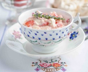 6.Break the meringues into small pieces and place in a bowl. Add all the other elements and mix together. Spoon into bowls or vintage tea cups to serve, decorated with extra lavender flowers.