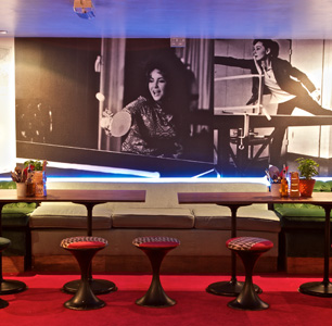 Vintage photographs of Audrey Hepburn and Bob Marley adorn the walls, giving a street art vibe and chesterfield banquette seating adds to the shabby chic style. Exposed crating decorate the walls and rustic mirrors all add to the urban chic atmosphere of Ping.