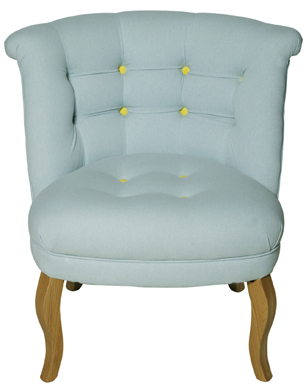Upholstered in a soft duck egg shade with contrast yellow buttons, this cotton tub chair is the ideal luxury lounging chair. Mix and match with wood and print for a retro look.