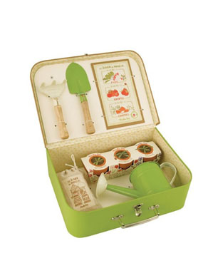 The beautiful suitcase style gift box contains small metal garden fork and rake, three terracotta flower pots, three earth tablets (add double their volume of water to expand), a selection of vegetable seeds and a cream and green metal watering can – perfect for little ones discovering the joy of gardening.