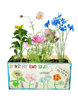 Designed to engage children in a love of growing, the colourful box has a picture of the plants to be grown ready to colour in on the back – in this case cosmos, nasturtium, cornflowers, sunflowers.
