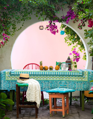 Bring some east-meets-west chic into your garden space this summer, with rich, Indian inspired colour, bold floral prints and vibrant glassware. Clash turquoise with fuchsia, busy floral prints with bold paisley, and introduce a wealth of tropical flowers and lush green foliage, even if you do have to cheat with a couple of faux ones.