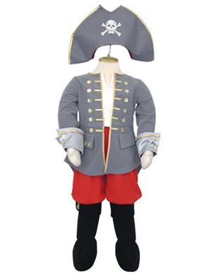 Boys Pirate Captain Costume includes a grey jacket with gold trim and red trousers with mock black boot with golden buckles. Also comes with a captains hat embroidered with a skull and cross bone. Available in 2 sizes from 3 to 8 years.