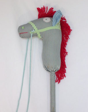 A sweet alternative to the classic designs, this pinstripe fabric horse with scarlet red wool mane and soft polka dot ears is full of cartoonish charm.