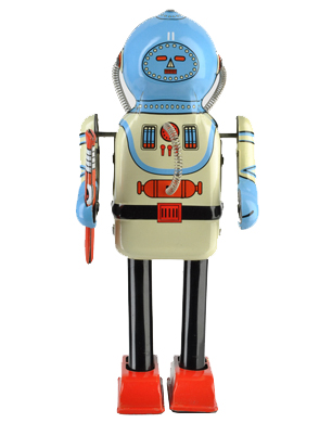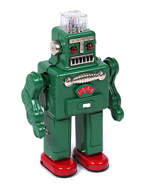 Complete with wheels under his feet and red sparkling light eyes, this little fellow is the ultimate in robot toys. Sure to be a hit with robot collectors young and old.
