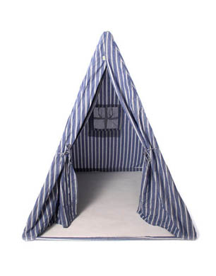 This striped wigwam stands apart with its delightfully sweet details of a rear window, roll-up curtains and outside pockets. This tipi-come-home will make a great quiet reading spot for all those little book worms out there.