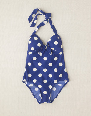We love this retro polka dot swimsuit with halter-neck tie. This swimsuit is great for pear shape figures as the polka dots act as a balancing effect.