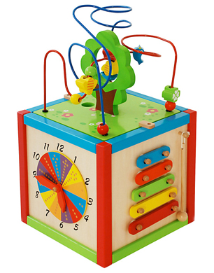 Featuring five activities in one toy, this multifunctional activity cube offers a chalkboard for doodles and drawings, a xylophone for that music maestro, a fun maze to help engage hand eye coordination, a bead coaster and number spinner.