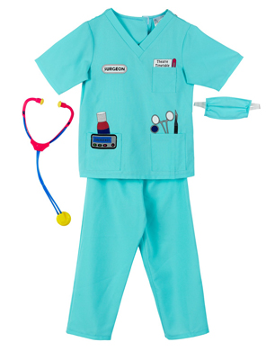 Complete with an identity badge, green trousers and stethoscope, this doctor’s scrub uniform is the perfect costume for pretend play.